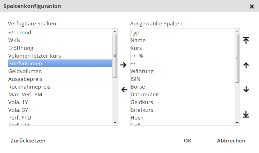 | Wählen Sie dieses Icon, um die Spalten der Watchlist auszuwählen und anzuordnen. Im erscheinenden Dialogfenster "Spaltenkonfiguration" finden Sie im Abschnitt "Verfügbare Spalten" die auswählbaren, im Abschnitt "Ausgewählte Spalten" die anzuzeigenden Spalten. Wählen Sie die Spalten Ihrer Watchlist mit den Pfeil-Icons in der Mitte des Dialogfensters aus. Legen Sie die Reihenfolge der Spalten mithilfe der Pfeil-Icons auf der rechten Seite des Dialogfensters fest.