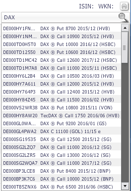 Geben Sie oben rechts im Eingabefeld den Suchbegriff für den Optionsschein ein. Das kann z. B. der Name des Optionsscheins bzw. des Basiswerts, die ISIN oder die WKN des Optionsscheins sein.