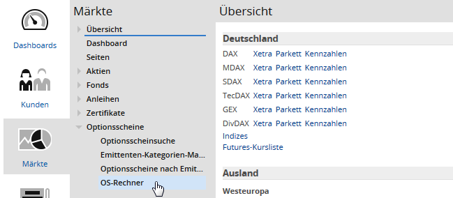 Den OS-Rechner öffnen Sie alternativ auch über den Menüeintrag "Optionsscheine", "OS-Rechner" im Navigator des Bereichs "Märkte".