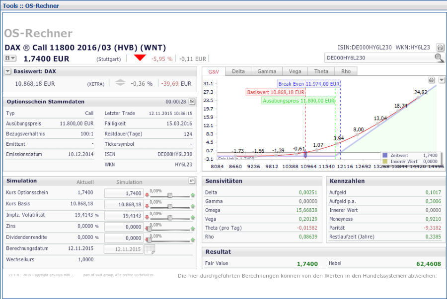 Mit dem OS-Rechner (Optionsscheinrechner) können Sie einfach und übersichtlich unterschiedliche Szenarien der Entwicklung eines Optionsscheins simulieren. Der OS-Rechner bietet einen umfassenden Überblick über alle wichtigen Daten, Simulationsergebnisse und Kennzahlen.