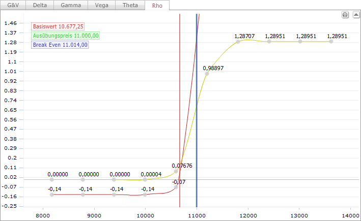 Auf der Registerkarte "Rho" wird die gleichnamige Kennzahl im Chart visualisiert (Wert auf der y-Achse). Die senkrechten Linien symbolisieren den Kurs des Basiswerts (rot), den Basispreis (Strike, grün) und den Break-Even (blau).