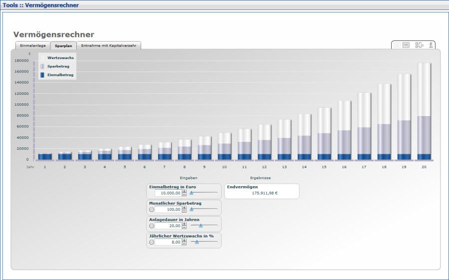 Auf der Registerkarte "Sparplan" können zusätzlich zu den Möglichkeiten bei der Einmalanlage noch monatliche Einzahlungen in einen Sparplan berücksichtigt werden.