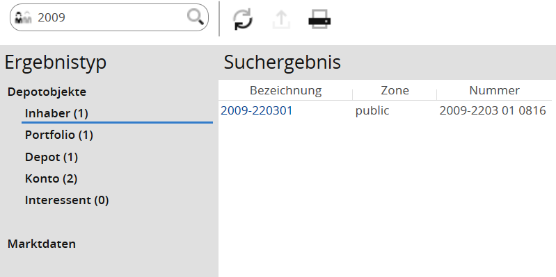 Ist das Produkt "Market Manager Financials Web" freigeschaltet, so wird im Bereich "Suchergebnis" zwischen den Ergebnistypen "Depotobjekte" und "Marktdaten" unterschieden. Sie können im Navigator zwischen diesen Ergebnistypen wechseln.