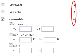 | Die Suchparameter sind in einzelne Bereiche wie "Basisinfo", "Erweiterte Info" oder "Kennzahlen" aufgeteilt. Diese Bereiche sind von Wertpapiertyp zu Wertpapiertyp unterschiedlich. Sie können die einzelnen Bereiche per Mausklick auf die Pfeilsymbole auf- und zuklappen.