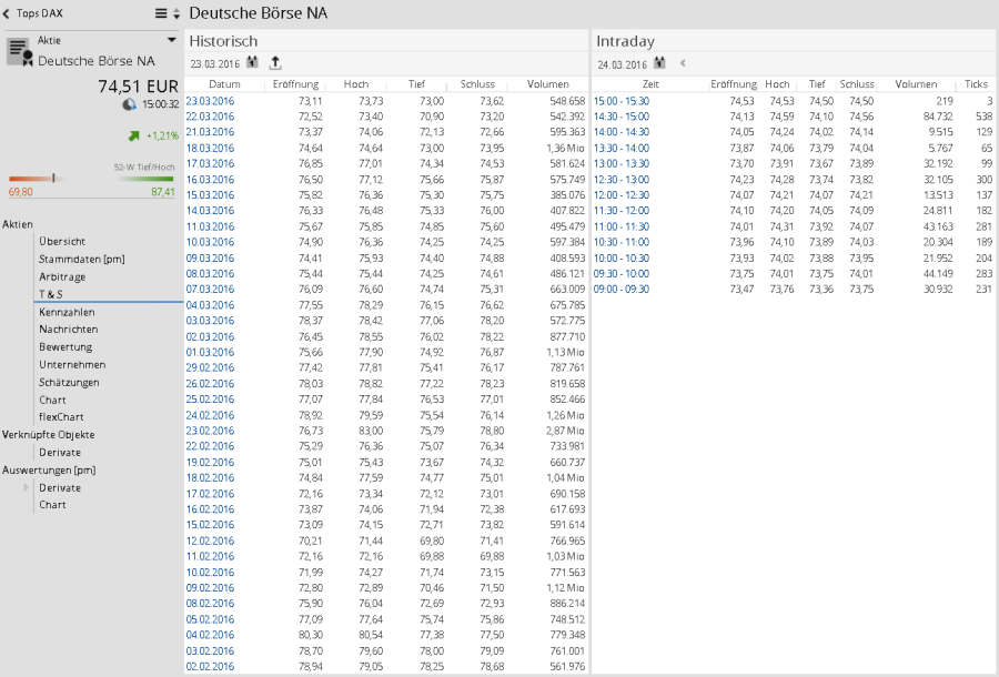 Times & Sales liefern Ihnen Tabellen, in denen Eröffnungs-, Hoch-, Tief- und Schlusskurse sowie Umsätze für das ausgewählte Wertpapier dargestellt werden – unterteilt in historische Daten und Intraday-Daten.