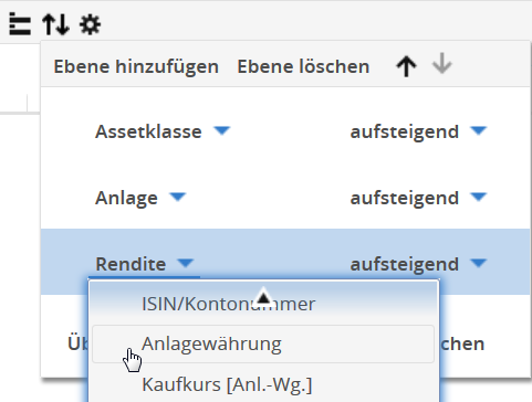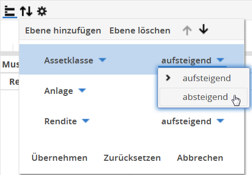 Wählen Sie in der Toolbar der Tabelle das Icon "Sortierung". Das Fenster zur Einstellung der Sortierung öffnet sich.