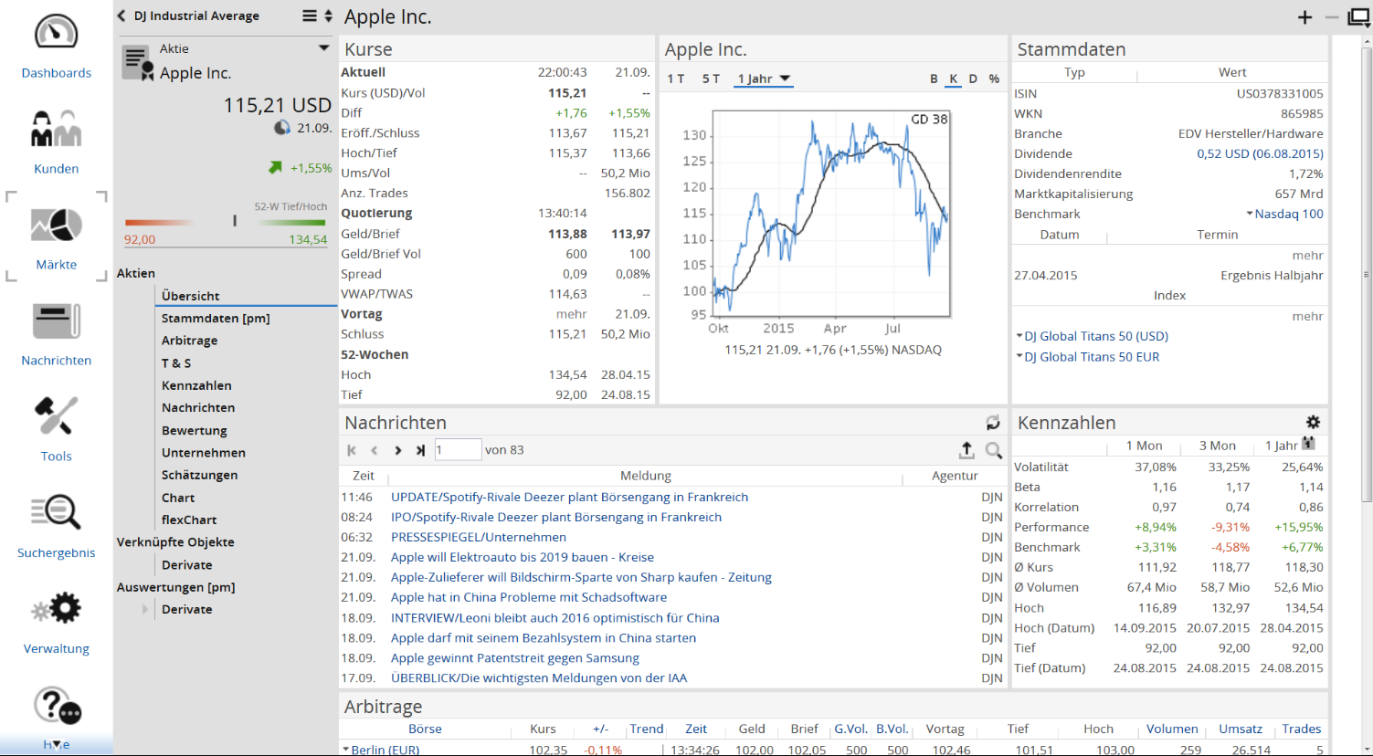 Wie gewohnt können Sie von hier aus über die verlinkten Elemente weiter springen und so ins Chartcenter oder in die Nachrichtenübersicht wechseln.