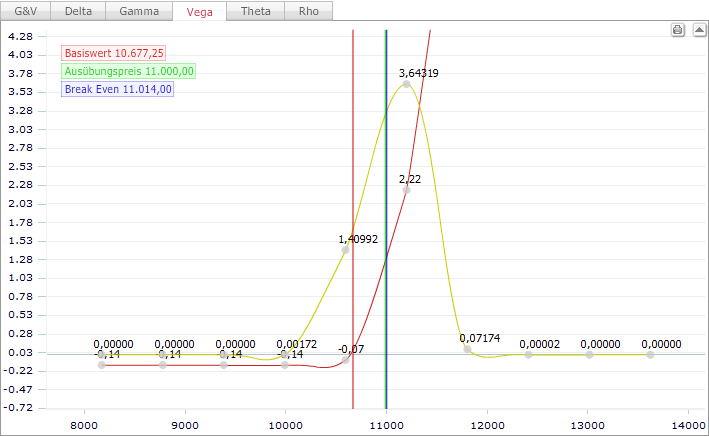 Auf der Registerkarte "Vega" wird die gleichnamige Kennzahl im Chart visualisiert (Wert auf der y-Achse). Die senkrechten Linien symbolisieren den Kurs des Basiswerts (rot), den Basispreis (Strike, grün) und den Break-Even (blau).