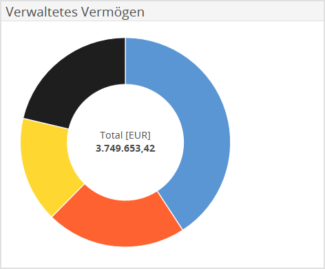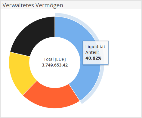 Das Widget "Verwaltetes Vermögen" zeigt im Ringdiagramm die Aufteilung der Portfolios nach ihren Assetklassen – z. B. Liquidität, Aktien, Anleihen oder sonstige Assetklassen. Zusätzlich sehen Sie in der Mitte den Gesamtwert der verwalteten Portfolios.