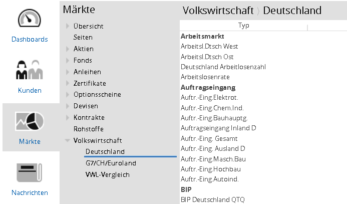 Im Bereich "Märkte" finden Sie unter dem Menüeintrag "Volkswirtschaft" im Navigator auch alle wichtigen volkswirtschaftlichen Daten. Sie können Sie über drei untergeordnete Menüeinträge die entsprechenden Regionen bzw. Rubriken auswählen.