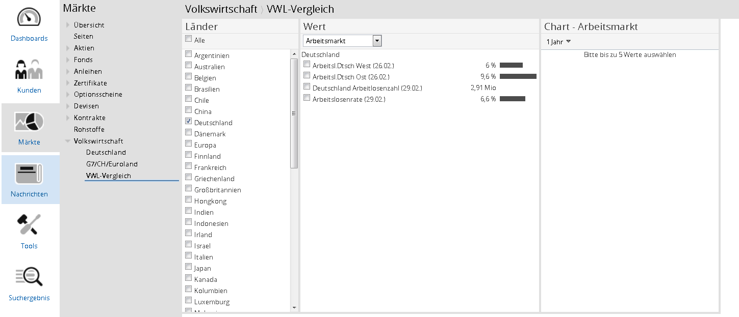 Auf der Registerkarte "VWL-Vergleich" können Sie volkswirtschaftliche Daten eines Landes anzeigen sowie die Daten von bis zu 5 Ländern miteinander vergleichen. Gehen Sie dazu wie folgt vor: