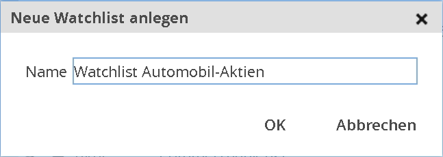 - Geben Sie in das erscheinende Dialogfenster "Neue Watchlist anlegen" einen Namen für die Watchlist ein.