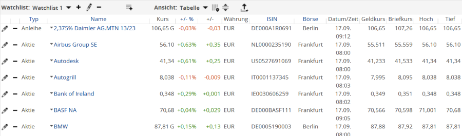 Beobachten Sie in individuellen Watchlisten Ihre favorisierten Wertpapiere. Dabei steht Ihnen neben der tabellarischen Darstellung auch eine Chart-Galerie der Positionen zur Verfügung.