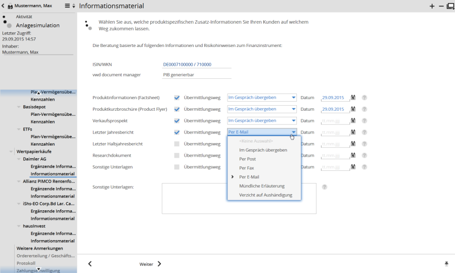 Erfassen Sie hier, welche zusätzlichen Informationsmaterialien Sie dem Kunden für das entsprechende Wertpapier wann und auf welchem Weg zukommen lassen.