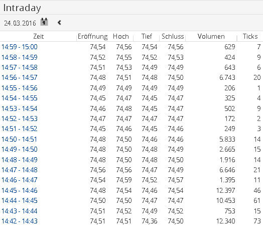 Wählen Sie ein solches 30-Minuten-Intervall wiederum in der Tabelle "Intraday" per Mausklick aus, so wird für diesen Zeitraum eine Tabelle mit einer Komprimierung auf Minutenbasis angezeigt.