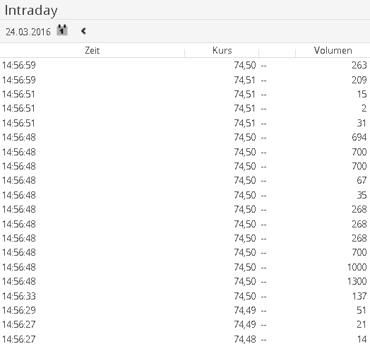 Wählt man ein solches Minuten-Intervall aus, dann werden die enthaltenen einzelnen Ticks mit Volumenangabe aufgelistet.