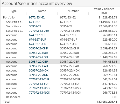 The "Account/securities account" client widget shows the portfolios, securities accounts and accounts as well as the special assets of the holder in a table with the "Type", "Name", "Number" and "Value/balance in analysis currency" columns.