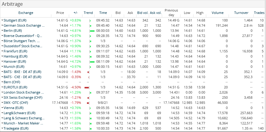 By clicking the names of the trading venues ("Exchange" column), you switch directly to the corresponding security portrait at this place.