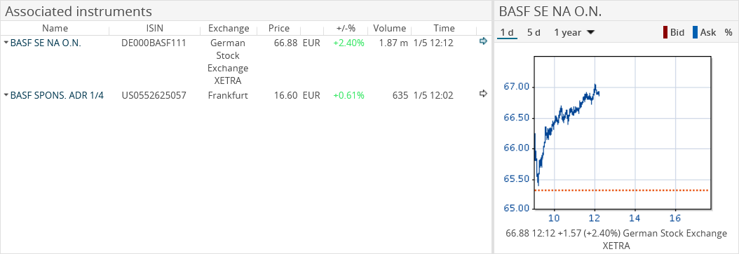If securities are assigned to the message currently selected in the news overview, they are listed in a table below the news text. In detail, the table contains the following functions in addition to the most important master and price data: