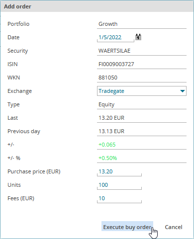 Securities that you add to a sample portfolio are "bought". Thus, a virtual buy order is therefore recorded. You can add to securities in various ways.