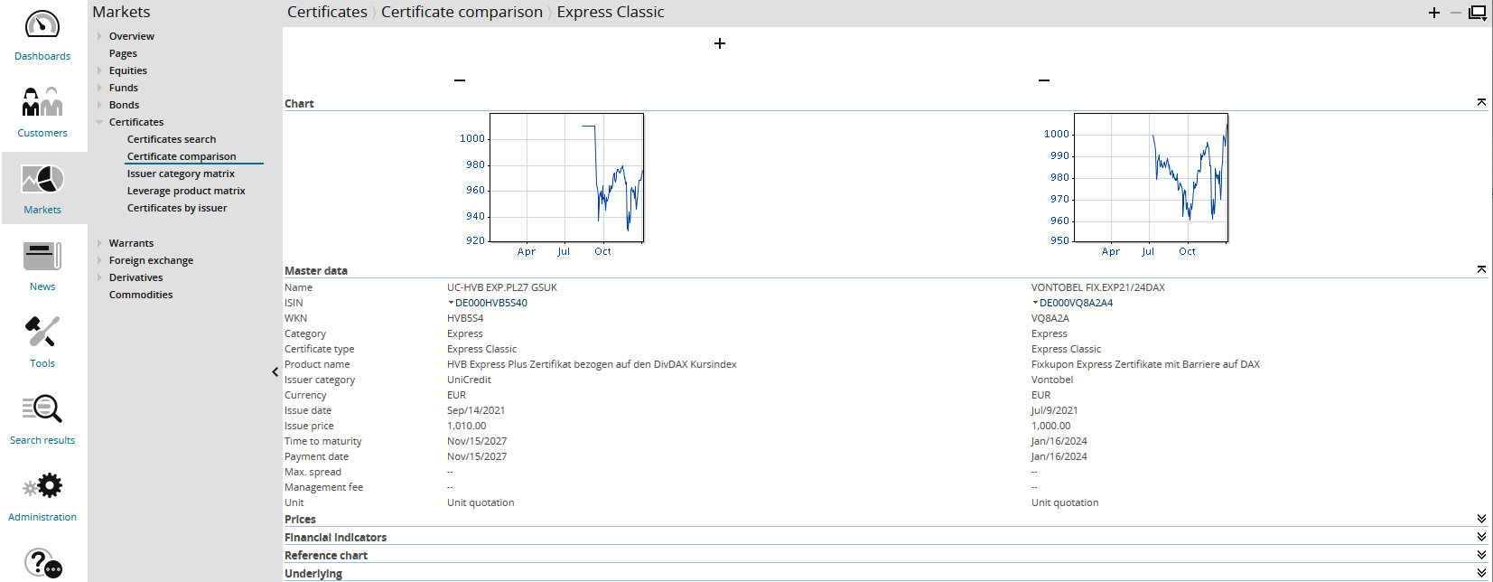 Underlying | In this area, you can find the most important information on master data and prices of the respective underlyings of the certificates:
