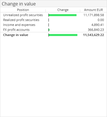 For each position, you see in the "Change" column the development since the specified start date and the absolute change in the "Amount" column in the selected currency.