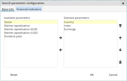 In the "Search parameter configuration" dialogue window that appears, you can show or hide the parameters, change their order or restore the default settings. Using the tabs at the top of the dialogue window, you can switch between the individual areas of the search parameters (in the example "Basic info", "Key figures" and "EDG rating", search for warrants). The parameters on the right ("Selected search parameters") are currently displayed on the search screen. On the left side, you see the currently hidden parameters. You have the following options: