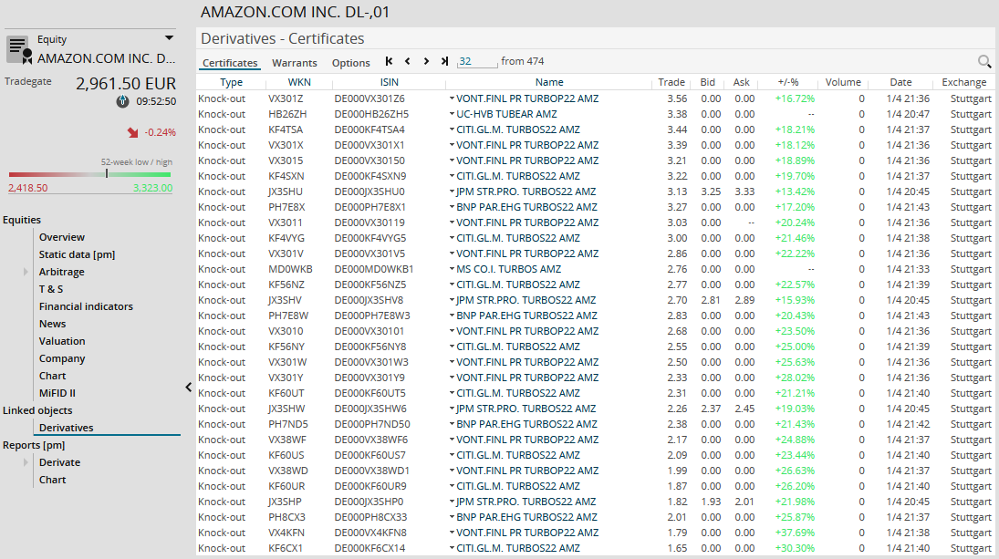 By using the "Linked objects" menu item, you can find certificates, warrants and, if activated, options associated with underlyings (equities, indices, foreign exchange).