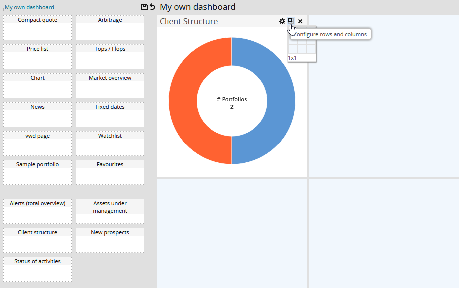 In the input field above, enter a new name for the holder dashboard. In edit mode, a panel with widgets appears instead of the navigation pane. You can drag them to the light blue cells. The widgets have at least the two icons "Configure rows/columns" and "Remove element". If there are further parameters, you also find the "Configure" icon. For more information on working with widgets, see Create global dashboard.