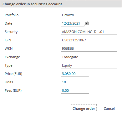 In the "Change order in securities account" dialogue window, you can then change the data (date, price, number of units, fees) and confirm with the "Change order" button. The transaction and the resulting values in the sample portfolio are updated accordingly.