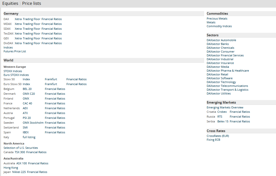Select the "Price lists" menu item to open the overview page with important indices. From this page you can open the price lists of the index participants by clicking on the links.