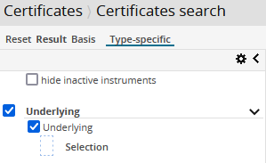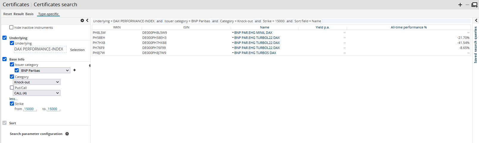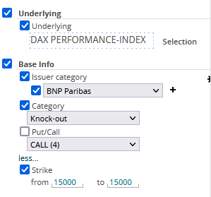 Select the "Strike price" checkbox and enter "7500" in the fields "from" and "to". In the search results, you will now see the certificates found (in this example exactly one suitable one):