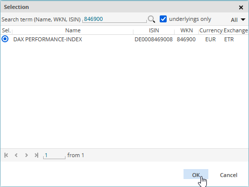 Open the security search by clicking the "Selection" button and search for DAX (for example, by using the ISIN DE0008469008).