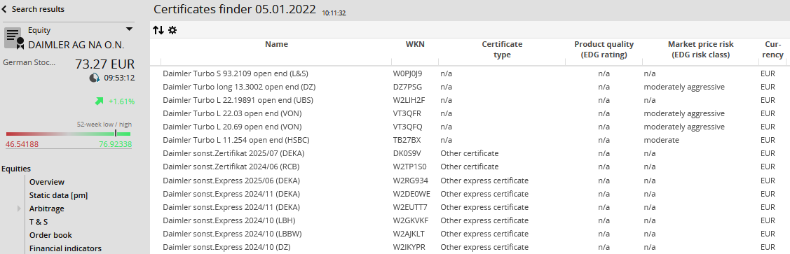 The "Certificates" finder searches for the currently selected security in the database for certificates that have this security as underlying.