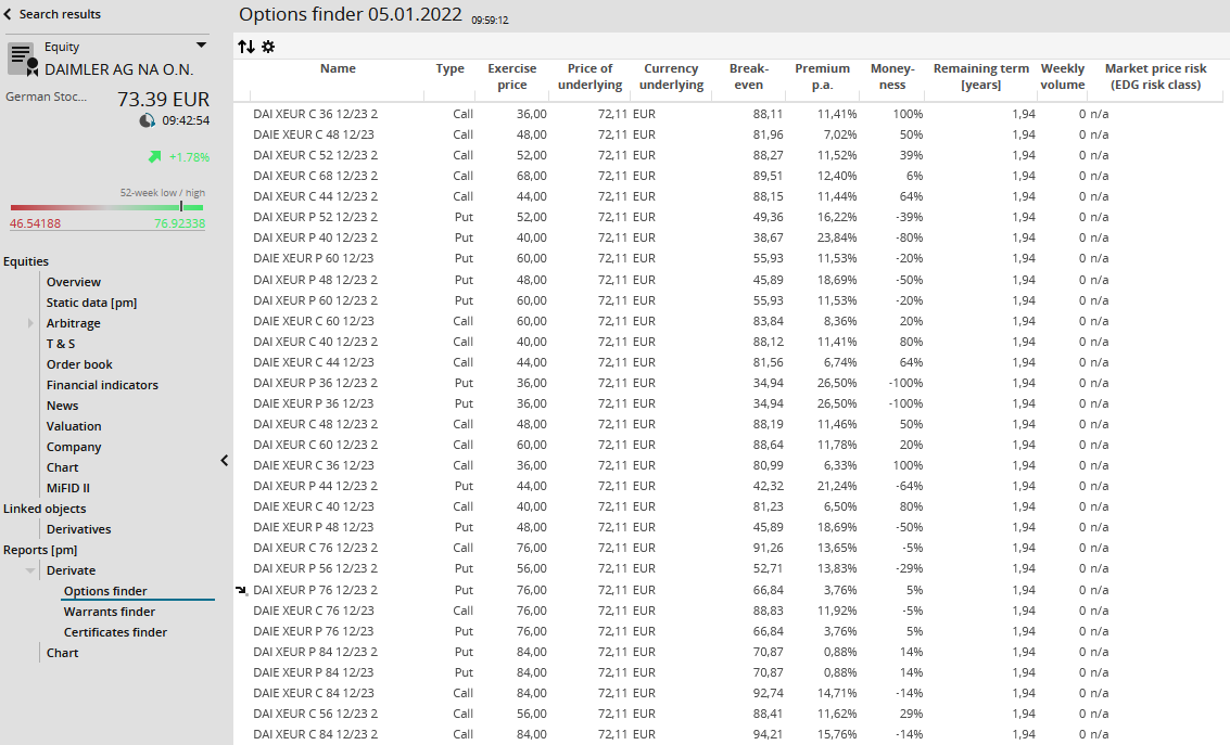 The "Options" finder searches for the currently selected security in the database for options that have this security as underlying.