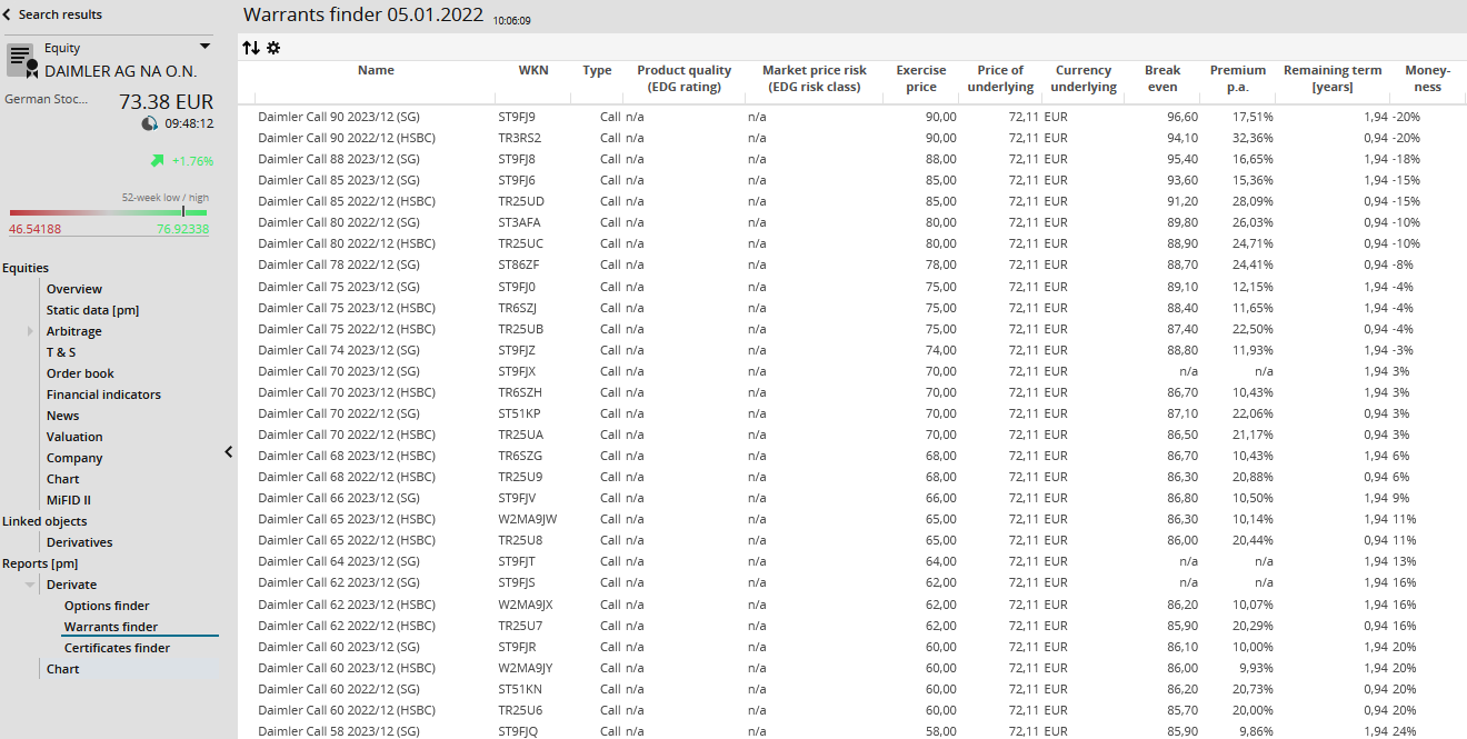 The "Warrants" finder searches for warrants in the database for the currently selected security, which have this security as underlying.