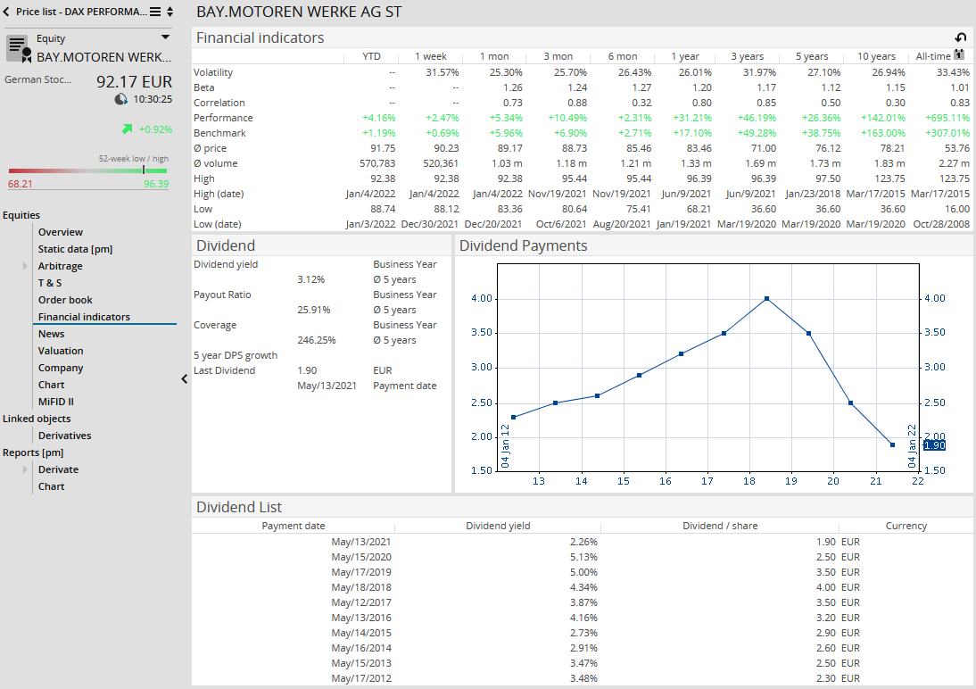 This menu item opens an overview of the most important indicators (calculated by Infront). In addition to the actual security indicators, you also see information on dividend payments.