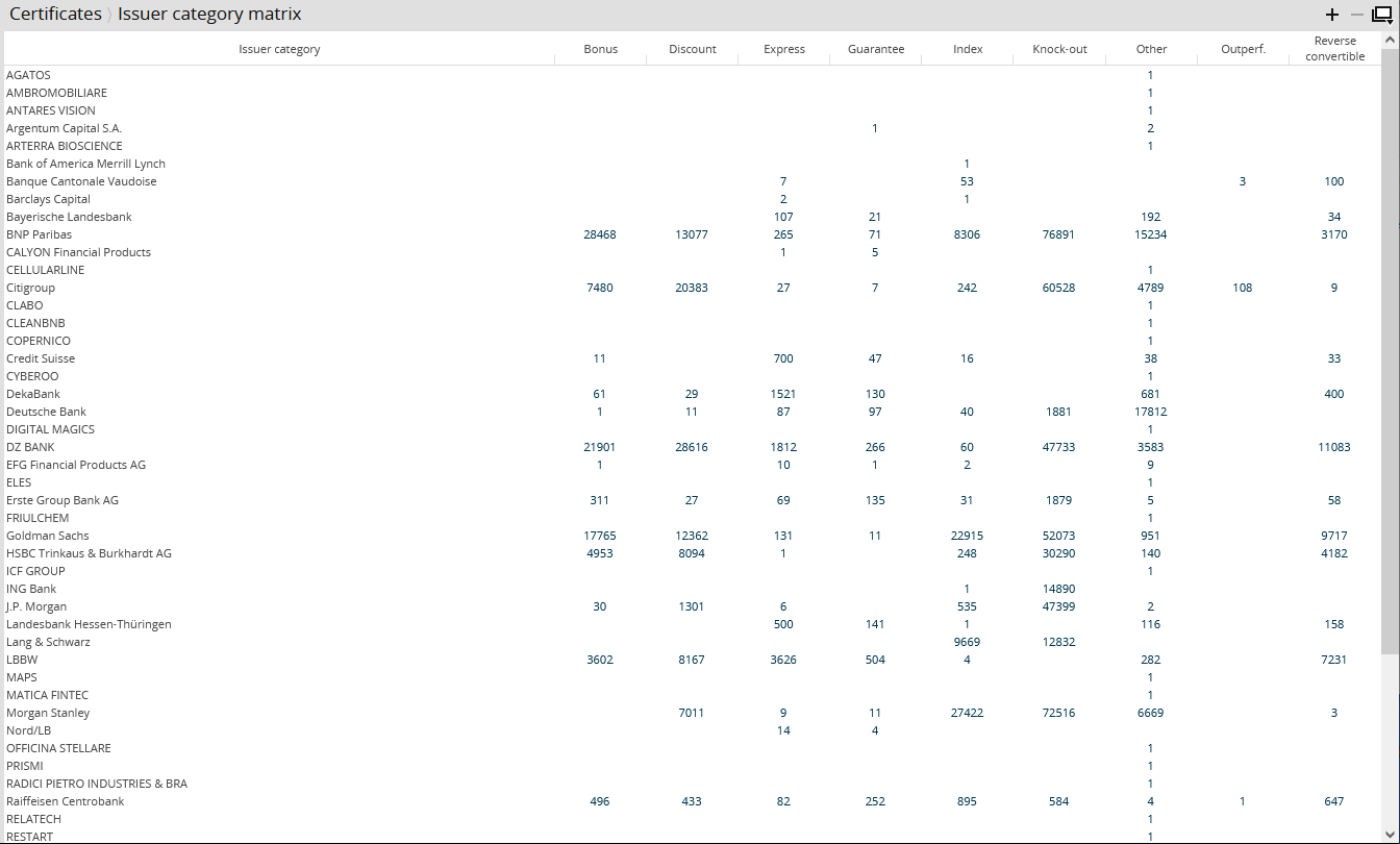 The matrix shows you at a glance how many certificates the individual issuers offer, broken down by certificate type. In addition, the Issuer Category Matrix also shows the total number of the respective certificate type (in the "Total" row). Thus you can quickly find and display comprehensive information about the certificate market.