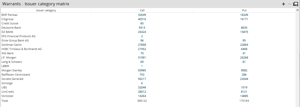 The matrix shows you at a glance how many warrants the individual issuers offer separately according to calls and puts. In addition, the issuer category matrix also shows the total number of the respective warrant type (in the "Total" row). Thus you can quickly find and display comprehensive information about the warrants market.