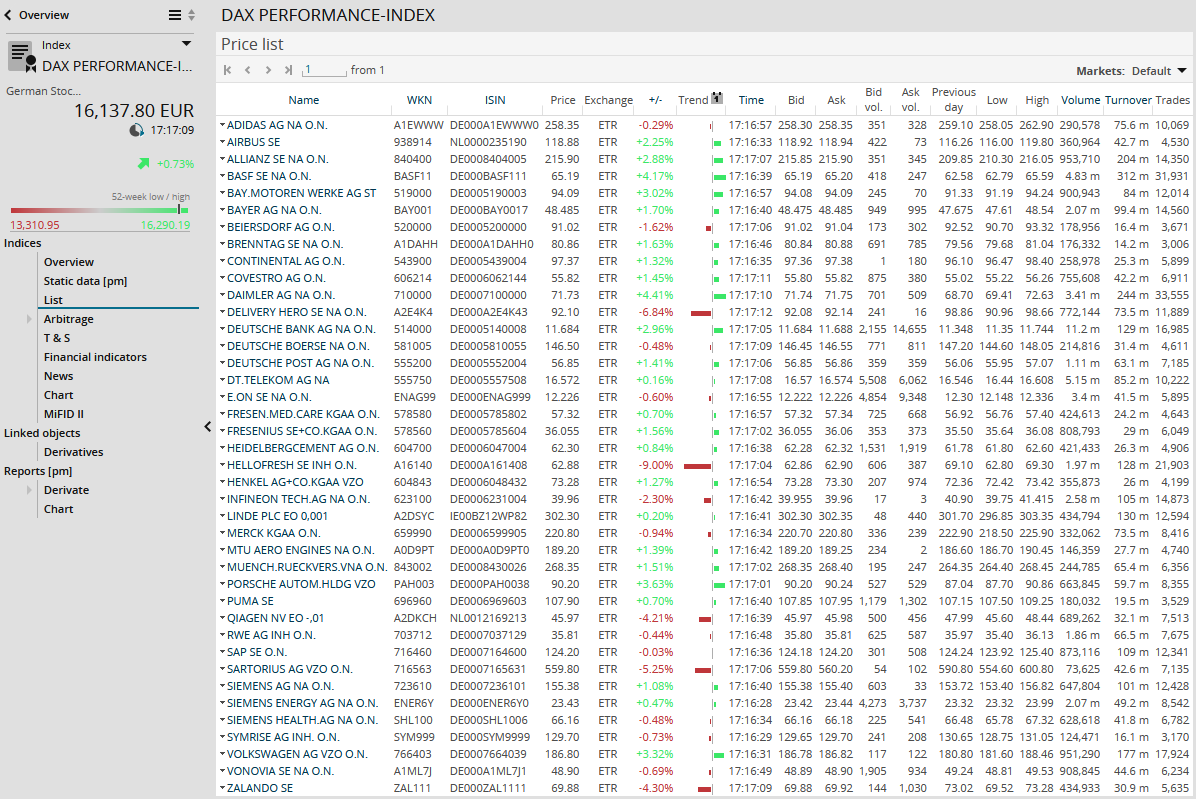 For securities of the "Index" type, you can open the index composition as a price list via the "List" menu item in the navigation pane of the securities portrait – for example, for the DAX the 30 individual securities from which the DAX is currently calculated.