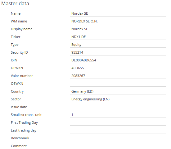 The master data from Infront Portfolio Manager contains all the important information about the security selected. You can also open these properties in Infront Advisory Solution by using the "Master data [pm]" menu item in the navigation pane of a security portrait.