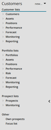 Example: Clients and portfolio lists in the navigation pane in the "Client" workspace