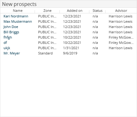 The "New prospects" widget shows the last created prospects, sorted in descending order by the "Created on" date. By default, the 10 latest created prospects are shown in the table with the "Name", "Zone", "Created on" and "Advisor" columns.
