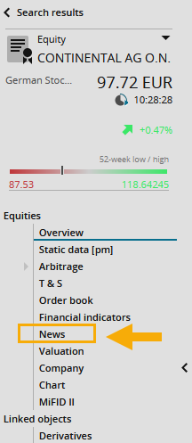 - If you have opened a security, you also have a "News" menu item in the navigation pane of the profile. Here, the news are then already filtered according to the currently selected security.