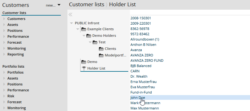 The search or selection of an object (for example, a holder or a portfolio in the client and portfolio lists in the "Customers" area) takes you to the corresponding object view. To select a holder or portfolio from the lists in the analysis area, follow these steps:
