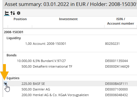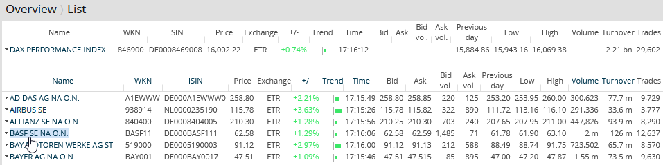 You can also open these securities portraits by using the search or selecting a security from the watchlists and so on. In the lists and overviews in the analysis area, you select a security as follows: