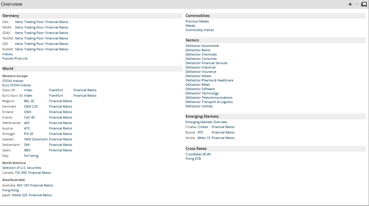 On the "Overview" tab, you will find the most important indices. Clicking the links opens, for example, the price lists of index members or lists of other indices, futures or exchange rates. Click the "Indicator" link to open the search and configure it.