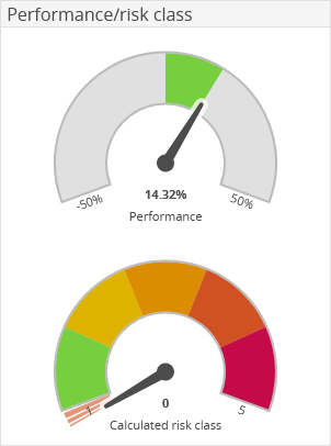 In two charts, the "Performance/risk class" widget shows the holder's performance and calculated risk class. The pointers allows you to quickly see the risk class and performance development. The exact values are given below the pointers.
