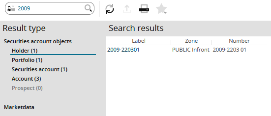 If the "Market Manager Financials Web" product is activated, then the "Search results" section distinguishes between the "Securities account objects" and "Market data" result types. You can select between these result types in the navigation pane.