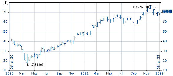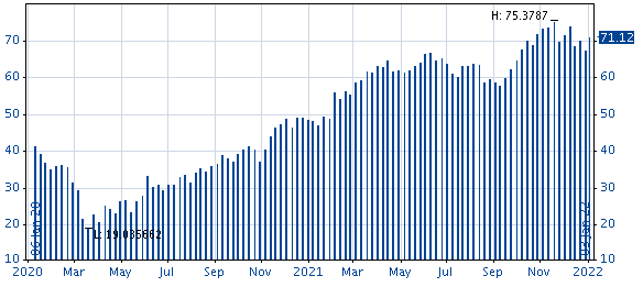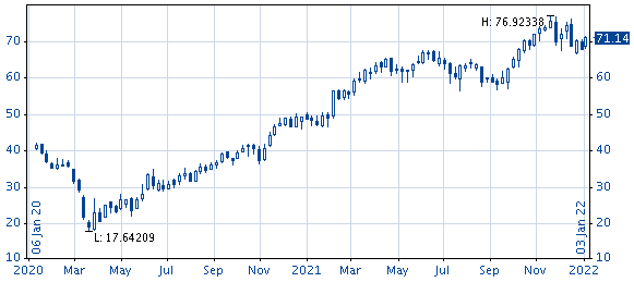 The candlestick charts are similar to the Open/High/Low/Close charts. Apart from the high, low, and close you can additionally see if the daily close is listed above or below the daily open. If the close is above the open, then the rectangle is shown in white (default setting); if it is below the open, then it is shown in blue.